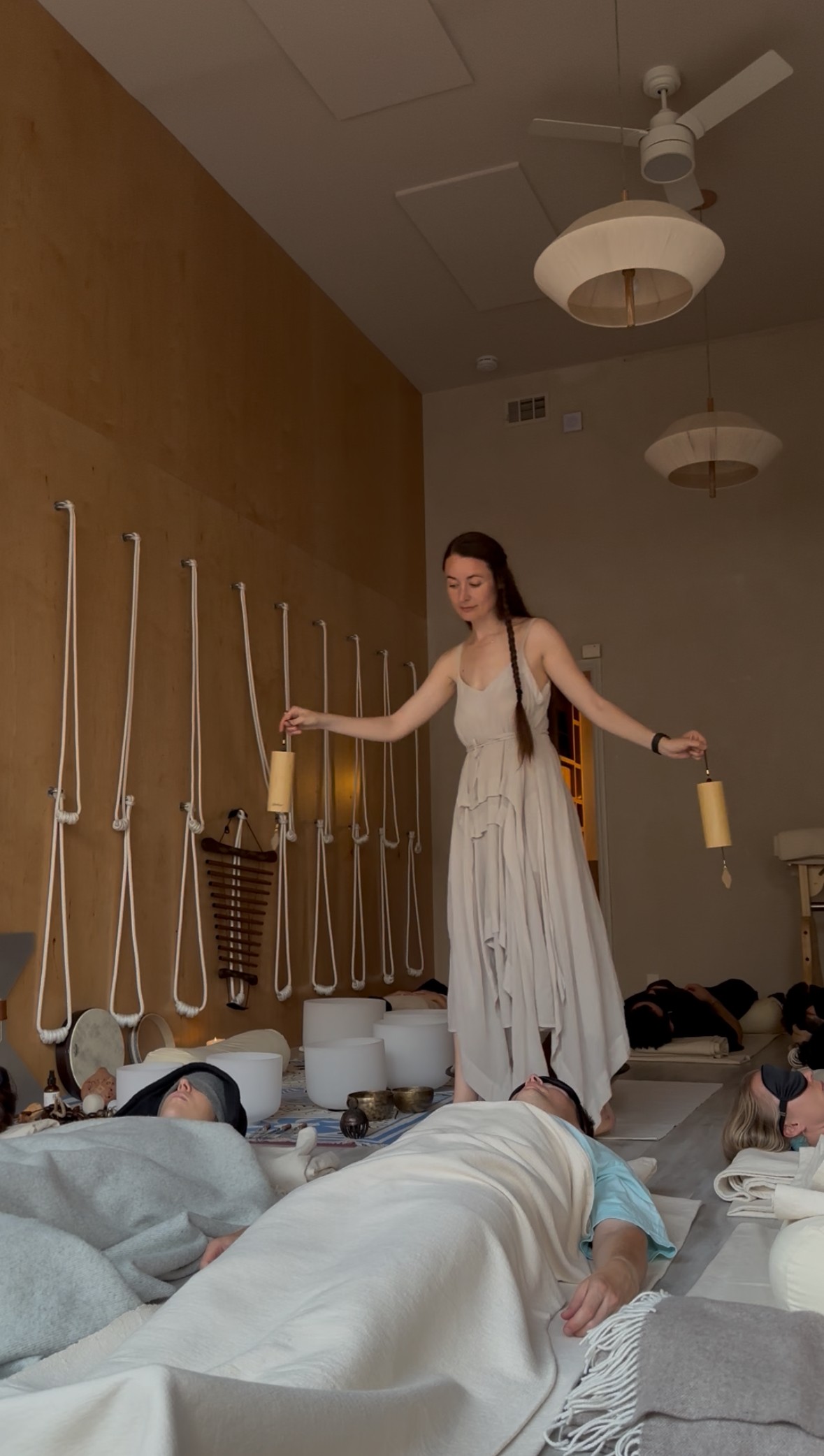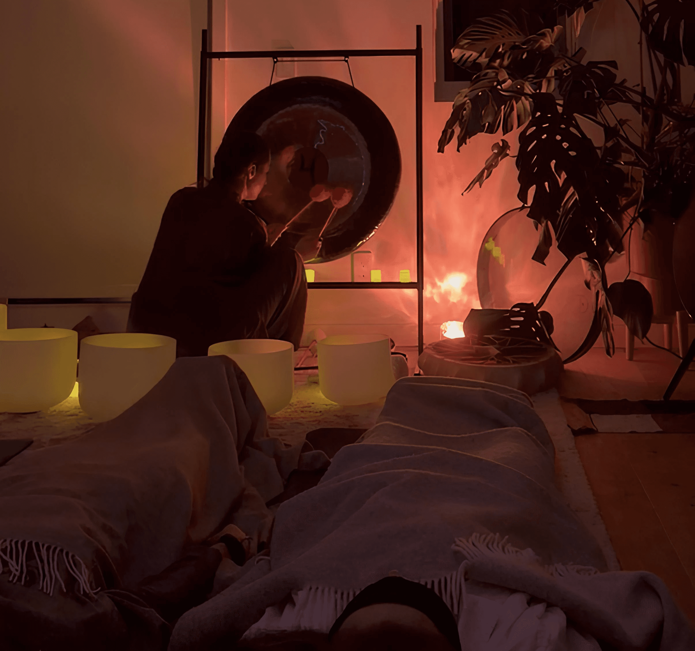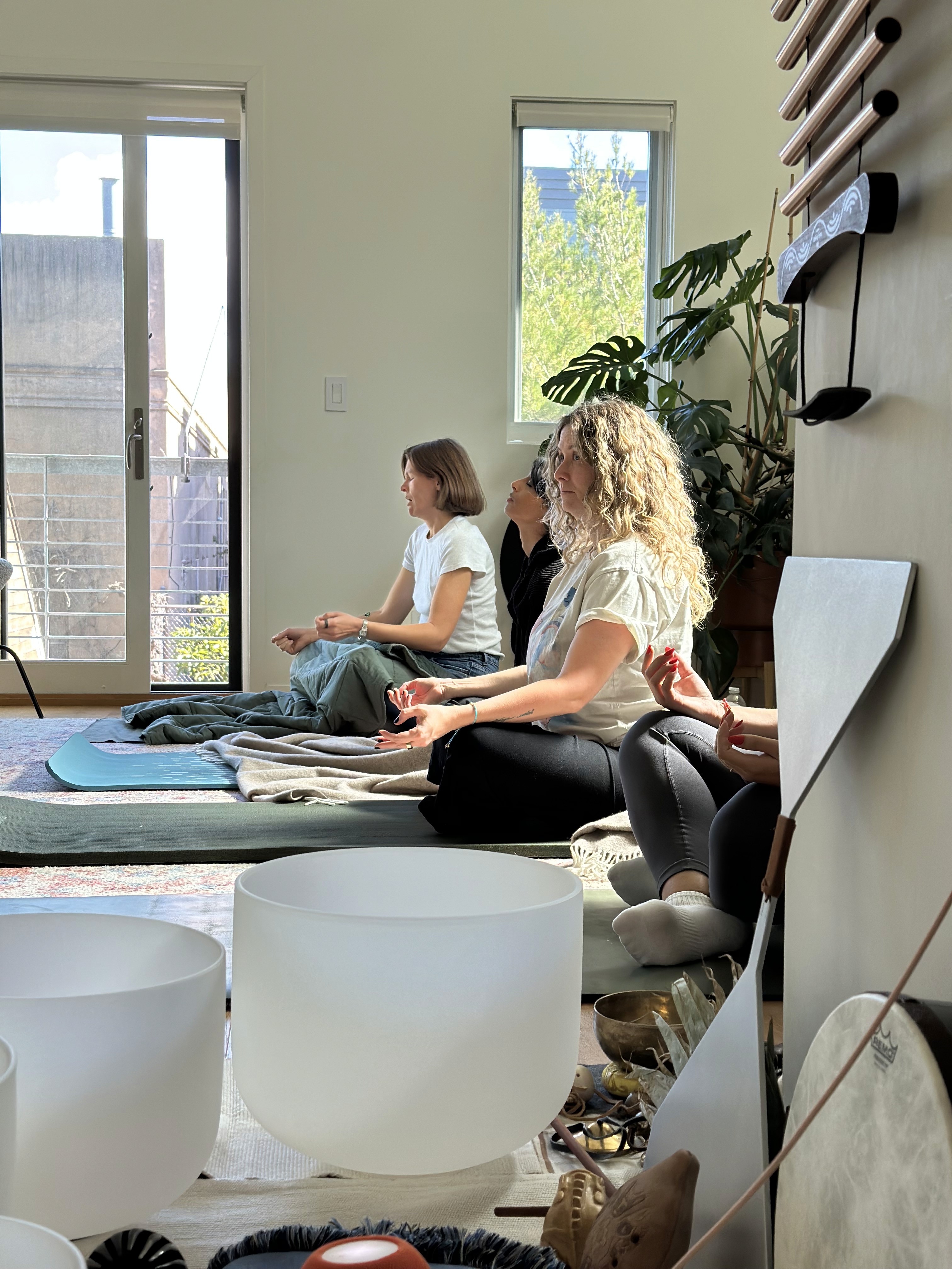 Each session follows a gentle, intentional arc. We begin with a short arrival — a few minutes to settle, land in the body, and arrive fully. This may include simple breath awareness or guided relaxation. The sound journey unfolds slowly using crystal singing bowls, chimes, drums, and other instruments, with pauses of silence woven throughout. You’ll rest comfortably on a mat, supported by blankets and props. At the end, there’s time to return gradually, often followed by a quiet tea ceremony or integration moment.
